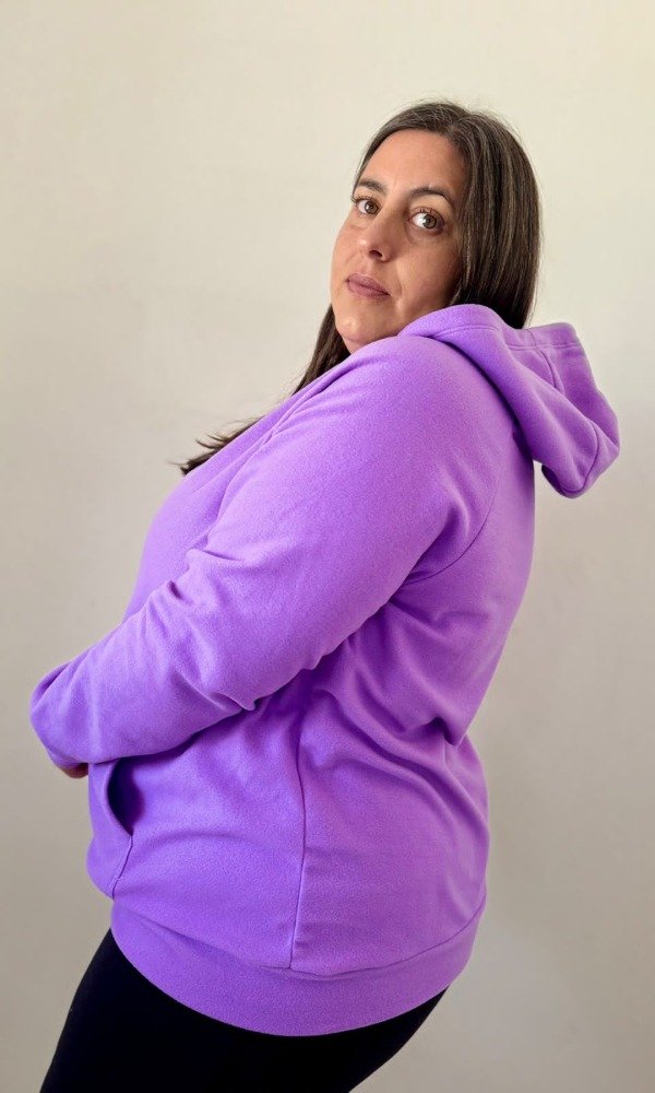 Posee capucha y bolsillos. Estilo canguro.